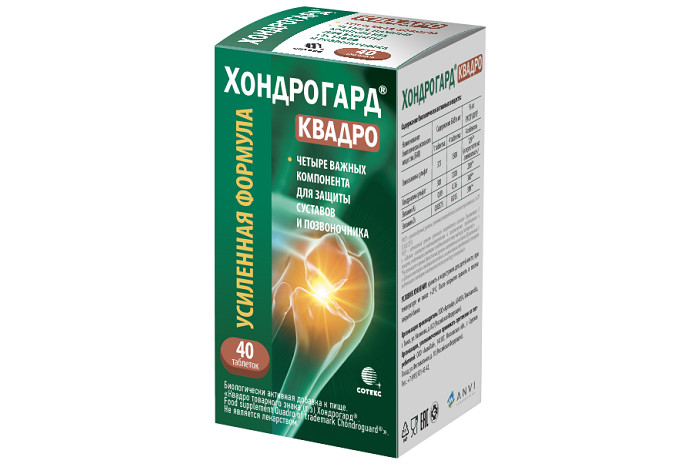 Область применения «Хондрогарда Квадро» — нутритивная поддержка здоровья суставов и позвоночника у лиц с остеоартритом и неспецифической болью в спине, а также при повышенной нагрузке на суставы и позвоночник (например, у спортсменов).