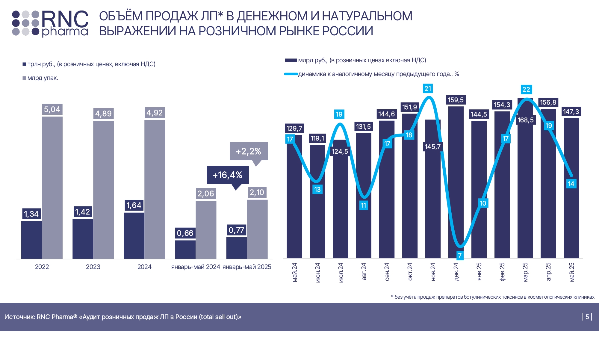 За первые четыре месяца 2025 года аптечные продажи лекарств составили 2,1 млрд упаковок на 0,77 трлн руб. По сравнению с аналогичным периодом 2024 года это больше на 2,2% в натуральном выражении и на 16,4% в денежном.