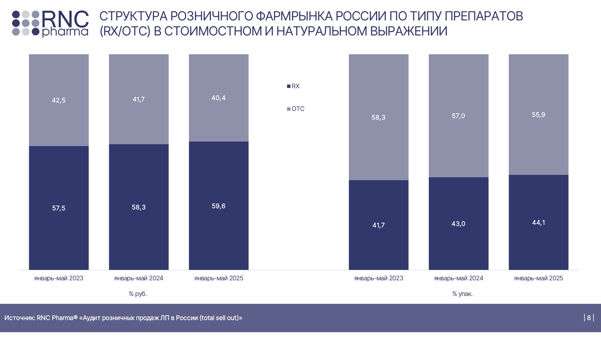 В январе – апреле 2025 года рецептурные препараты в продажах аптек заняли 59,6% в денежном выражении и 44,1% в натуральном выражении. ОТС-лекарства в аптеках в рублях заняли 40,4%, а в упаковках – 55,9%.
