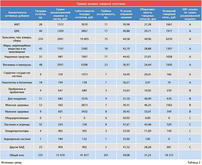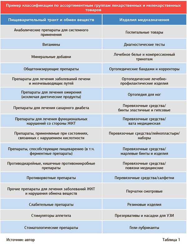 На сегодняшний день в аптеках насчитывается в среднем от 5 тыс. до 10 тыс. наименований товаров. Для упорядоченности процессов анализа товарного ассортимента целесообразно проводить его с использованием классификации. Целью такого разделения ассортимента является возможность дифференцированного подхода к управлению различными товарными категориями. Это позволяет применять к каждой категории общие правила управления: по частоте заказа, по величине нормативных и страховых запасов, по величине наценки. Правильное распределение всего ассортимента по товарным группам позволяет оценить ассортимент аптечного подразделения в целом, а также провести детальный анализ по основным показателям продаж в разрезе товарных категорий с целью его оптимизации.