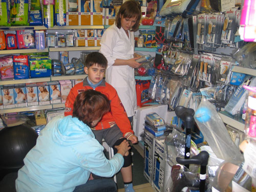 В центральной части зала выделена овальная зона, где представлено множество ортопедических товаров, средств для ухода за телом, занятий спортом. Здесь можно присесть, подобрать и примерить любое изделие. Вот как раз мама усадила своего ребенка в удобное кресло и вместе с провизором подбирает подходящий фиксатор для коленного сустава.