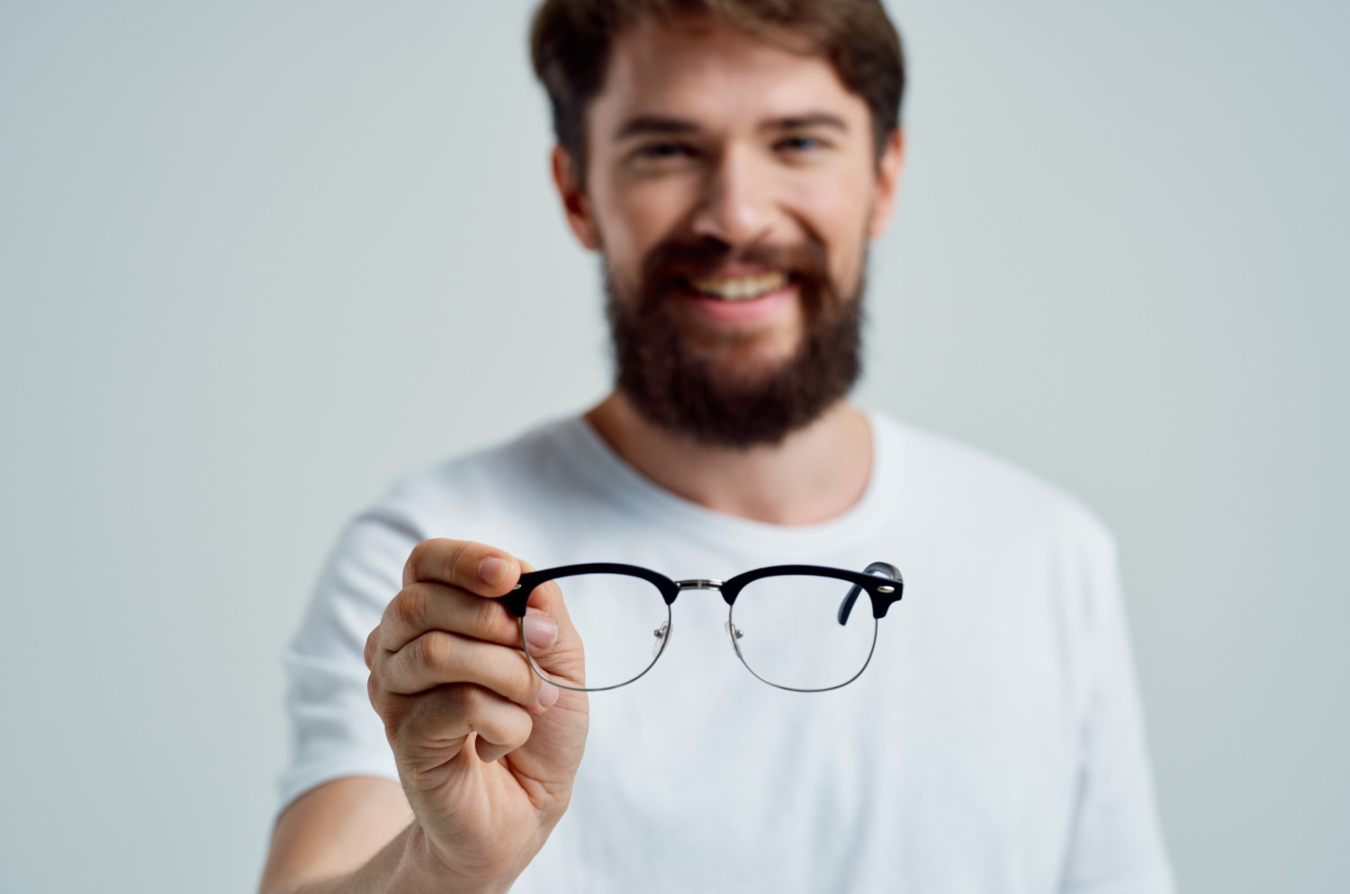 Когда очки запылились, загрязнились, мы снимаем их исключительно двумя руками. Нельзя тянуть в одну сторону, то есть за один заушник снимать, потому что мы деформируем форму оправы.