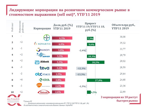 Лидирующей корпорацией по итогам YTD’11 2019 по-прежнему остается Bayer. Компания Novartis поднялась на две строчки рейтинга с приростом +10% к предыдущему году, обогнав Sanofi.