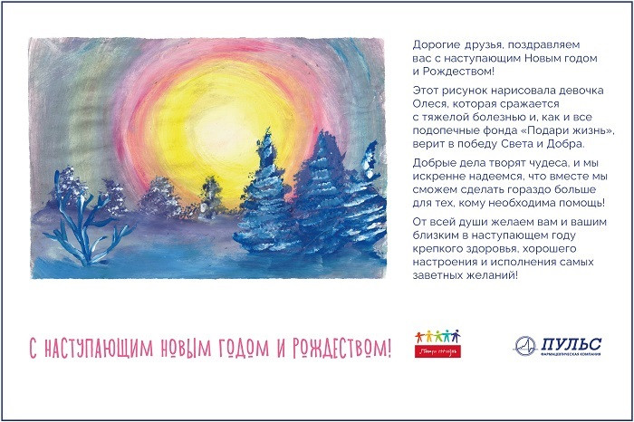 Благотворительность стала одной из ценностей нашей компании. И в наступающем году мы продолжим развивать волонтерское движение «Пульс», поддерживать подопечные фонды и организации и объединять наши усилия по оказанию помощи с другими участниками фармрынка, ведь, как гласит слоган благотворительной деятельности компании «Пульс»: «Вместе мы можем помочь больше».