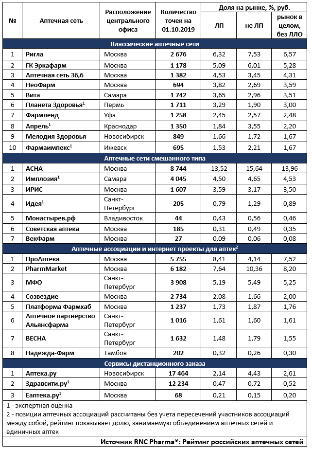 Таб. ТОП аптечных сетей по доле на розничном-коммерческом рынке ЛП России по итогам I-III кварталов 2019 года.