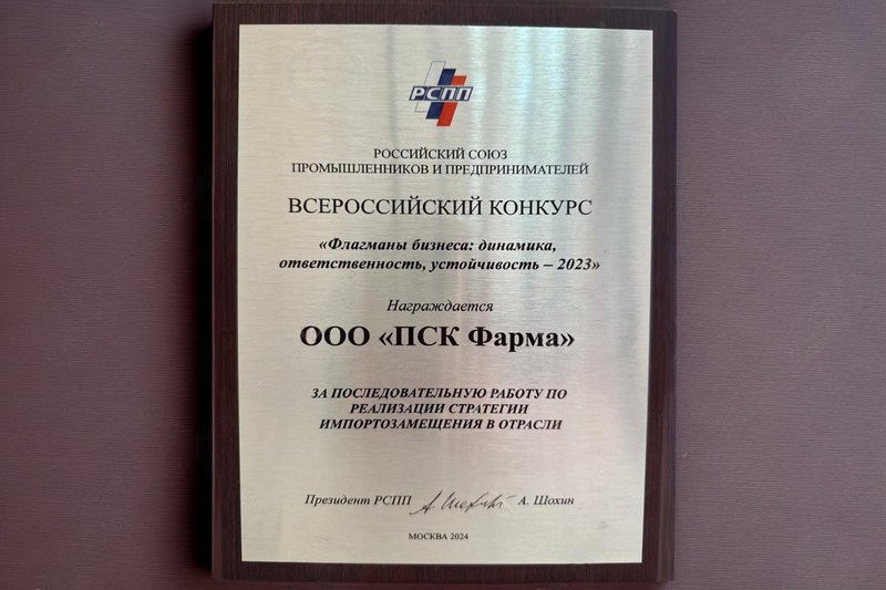 В преддверии Дня предпринимателя РСПП подвел итоги ежегодного рейтинга устойчивого развития отечественного бизнеса за 2023 год. Компания «ПСК Фарма» награждена дипломом за последовательную работу по реализации стратегии импортозамещения в фармацевтической отрасли. Дипломами также отмечены компании «ММК» и «Татнефть». Победили в номинации «Группа Оргсинтез» и «Акрон».